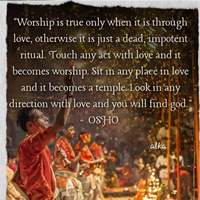 "Worship is true only when it is with love, otherwise it is just a dead impotent ritual. Touch any act with love and it becomes worship. Sit in any place in love and it becomes a temple. Look in any direction with love and you will find God." ~~ Osho